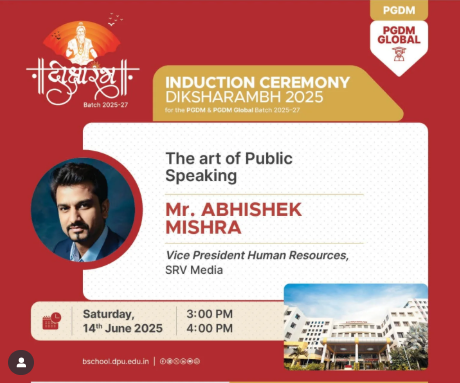 We are excited to have Mr. Abhishek Mishra, Vice President of Human Resources at SRV Media, join us for an engaging session on 14th June 2025, from 3:00 PM to 4:00 PM as part of Diksharambh 2025.In this session, ""The Art of Public Speaking"", Mr. Mishra will guide the PGDM and PGDM Global Batch 2025-27 students through the essential skills of effective communication and public speaking. With his extensive expertise in HR, he will offer practical advice on how mastering these skills can boost confidence, leadership abilities, and professional growth.This interactive session promises to be both inspiring and transformative for all participants!