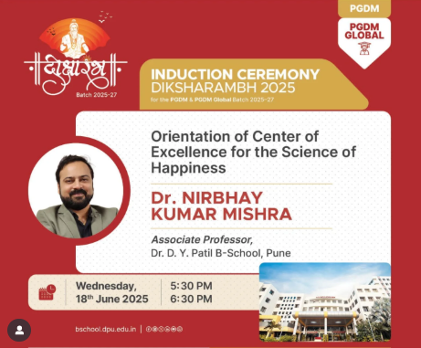 As the sun sets on another enriching day of Diksharambh 2025, students of the PGDM and PGDM Global Batch 2025–27 will come together for an enlightening session with Dr. Nirbhay Kumar Mishra, Associate Professor at Dr. D. Y. Patil B-School, Pune.From 5:30 PM to 6:30 PM, he will lead the Orientation of the Center of Excellence for the Science of Happiness — a space dedicated to inner growth, mental wellness, and purpose-driven learning. The session aims to introduce students to the fundamentals of emotional wellbeing and equip them with tools to build a more mindful and fulfilling academic journey.