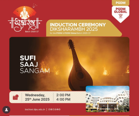 We invite students to experience a soulful musical journey with Sufi Saaj Sangam on 25th June 2025, from 02:00 p.m. to 04:00 p.m. This special event will immerse the PGDM and PGDM Global Batch 2025–27 in the rich tradition of Sufi music, blending spiritual melodies with rhythmic harmonies.The session promises to offer a unique opportunity to connect with music that transcends boundaries, fostering creativity, emotional expression, and cultural appreciation. Get ready to unwind, be inspired, and experience the powerful resonance of Sufi music in a session that will leave you feeling both rejuvenated and enlightened.