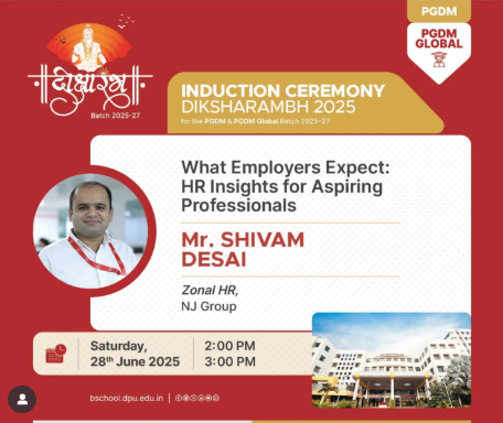 As part of the Diksharambh on 28th June, we’re excited to welcome Mr. Shivam Desai, Zonal HR at NJ Group, for a session focused on what employers truly expect from aspiring professionals. Mr. Desai will provide valuable HR insights into the skills, mindset, and strategies that can help job seekers stand out in a competitive job market.This session is a must-attend for anyone looking to understand the expectations of today’s employers and how to align their career goals accordingly. Join us from 02:00 p.m. to 03:00 p.m. for this insightful discussion!