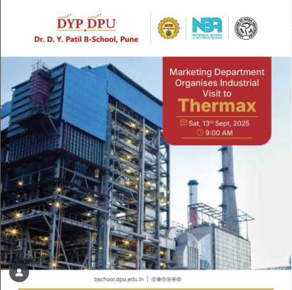 Excited to announce that the Marketing Department of Dr. D. Y. Patil B-School, Pune, is organizing an immersive industrial visit to Thermax, a leader in energy and environment solutions. This enriching experience, scheduled for Saturday, 13th September 2025 at 9:00 AM, will offer our students an invaluable opportunity to witness cutting-edge industrial practices, interact with industry experts, and bridge the gap between academic concepts and real-world applications. Such initiatives empower our budding marketers to sharpen their practical understanding, broaden their perspectives, and prepare to become future-ready professionals. Here’s to learning beyond classrooms and igniting curiosity for innovation!